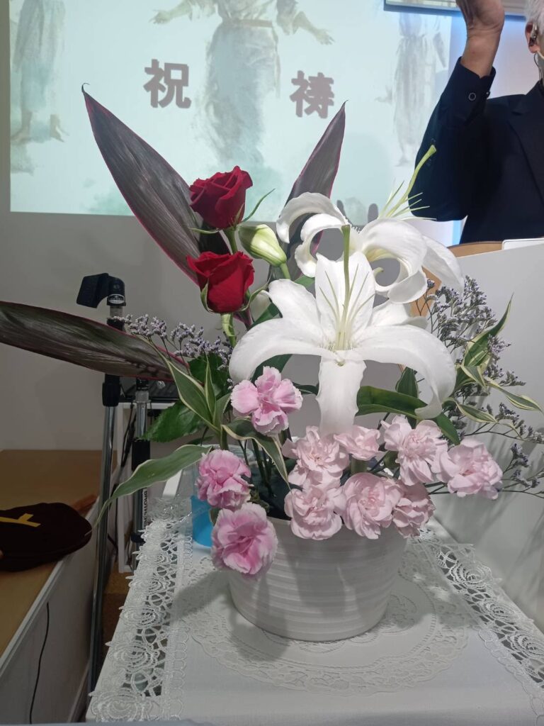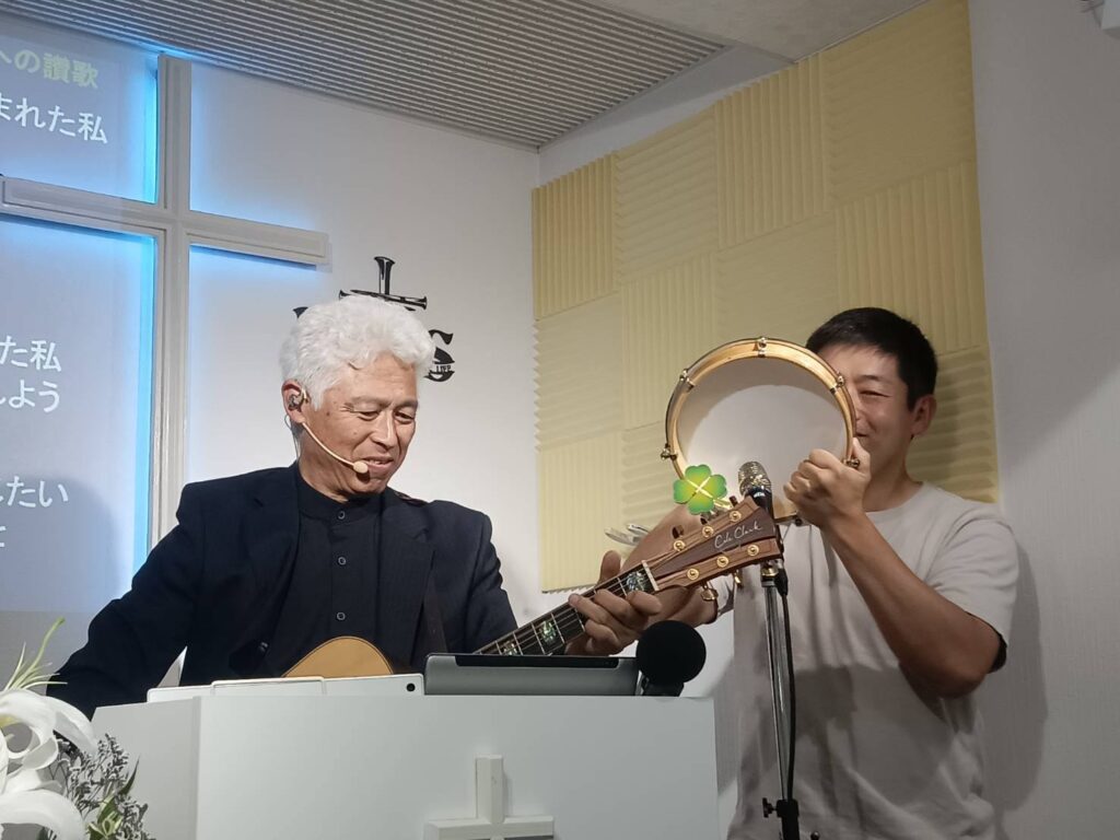 主日礼拝のランチは蕎麦とサツマイモのおこわ、信徒さんのご主人が釣って来られたアオリイカとメジロのお刺身。イカは歯ごたえが有りますが甘くて美味しかった。京都の美味しいお漬物も持って来てくださいました。甘味も信徒さんの差し入れで尼ヶ辻名物たまうさぎのきなこ団子。そうして特別讃美はアリスの明日への讃歌で息子がタンバを打ってくれました。